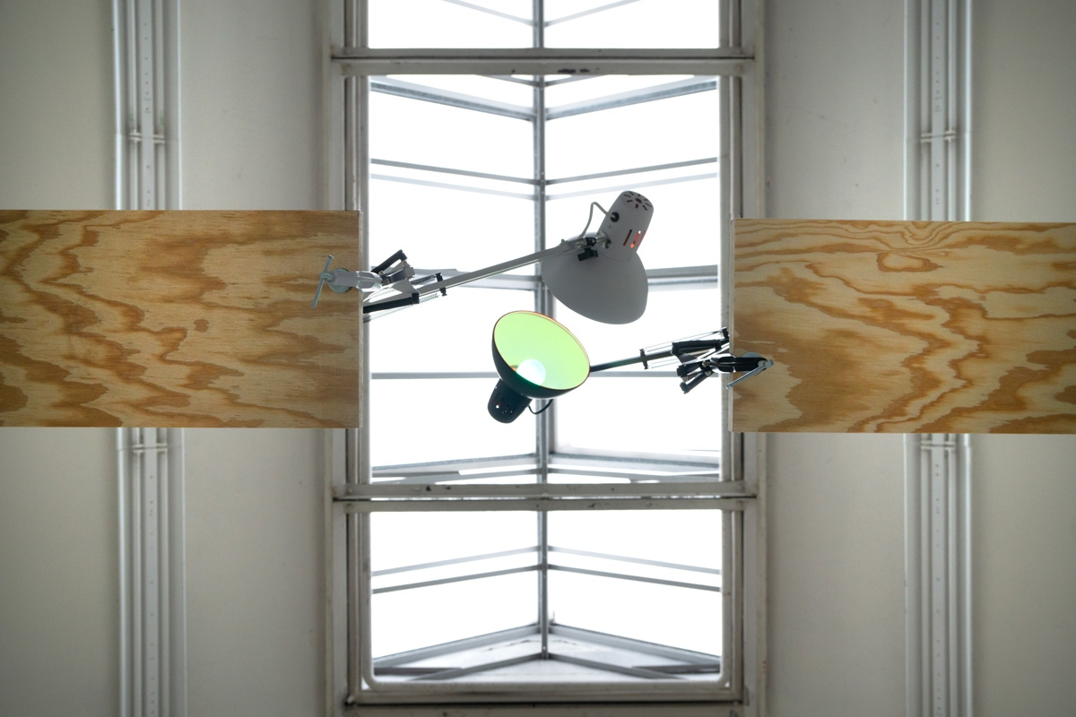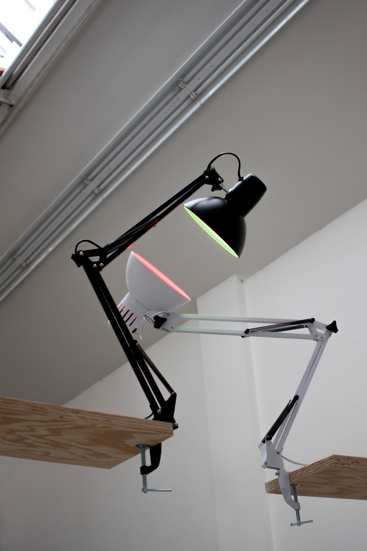 Desklamps, a green lightbulb and a red one, with improvised wooden structure to initiate a stereoscopic embrace.