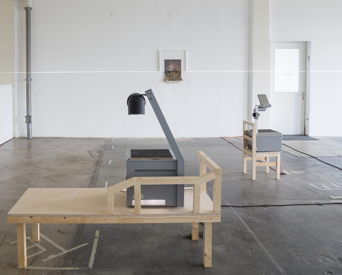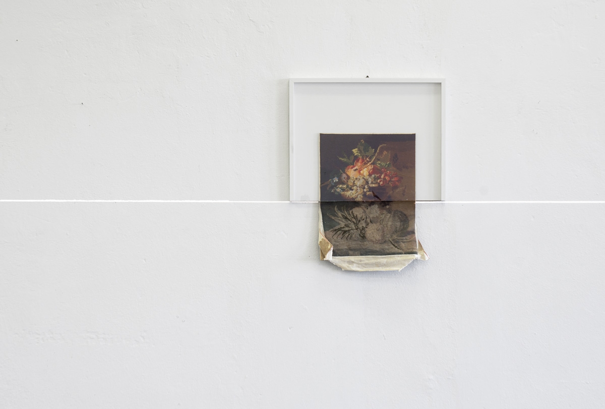 The projectors are resting on generic, schematic timber versions of recurring pieces of furniture from art history. On the wall is a stichtwork still-life. Its lower-half colours are faded and the glue holding the canvas to its board dissolved and untacked. It is also framed, though the frame is roughly cut in half, framing only the upper half, matching the midline of the actual canvas, as well as the hanging line of the wall highlighted by the projectors.