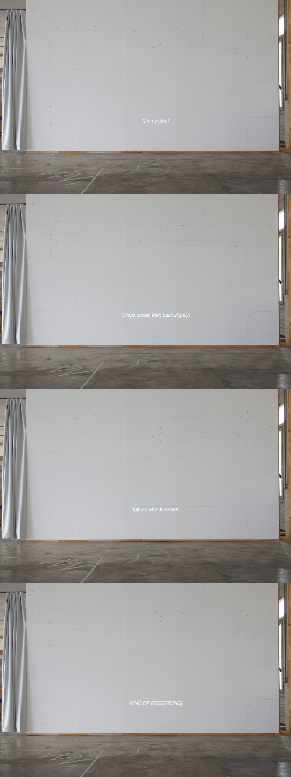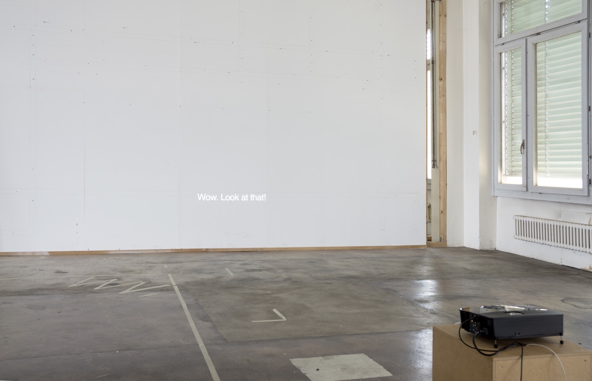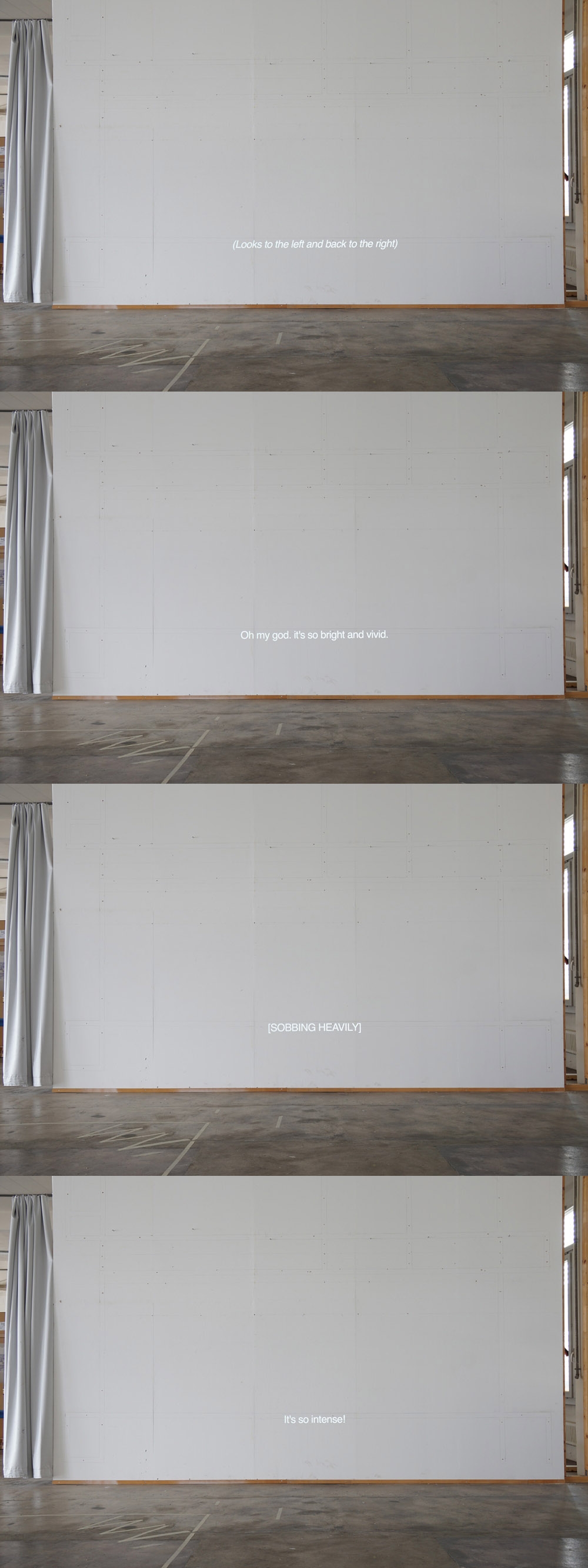 The word “rainbow” has been here omitted from the text, recontextualising its content to the exhibition space; the subtitles acting now as stage directions to the viewer looking at the very wall the text is projected on.