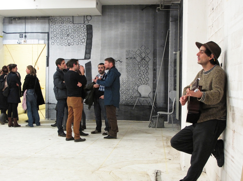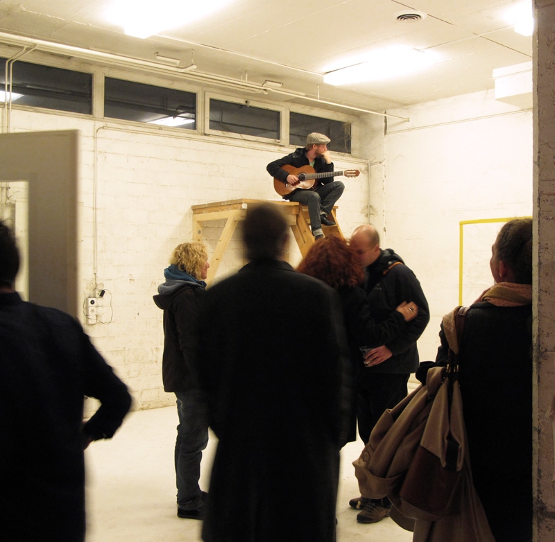 Live sculpture with a man and a guitar, and improvisation from exhibition blurbs.