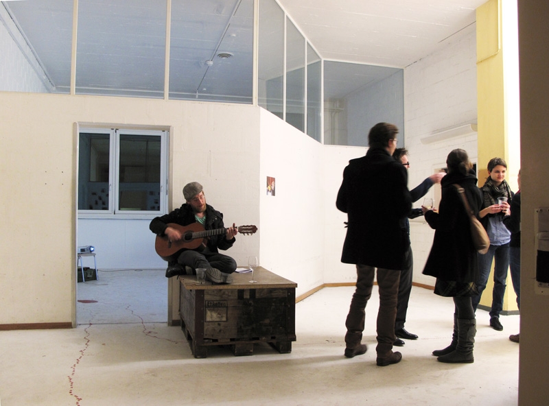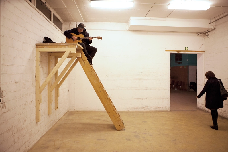 Man with guitar is a project involving a man with a guitar singing for himself in an exhibition setting. The man is making up some rhymes, improvising a song about what’s directly around him in a way that is reminiscent both of a troubadour and/or of a sideshow character from a western film scene.