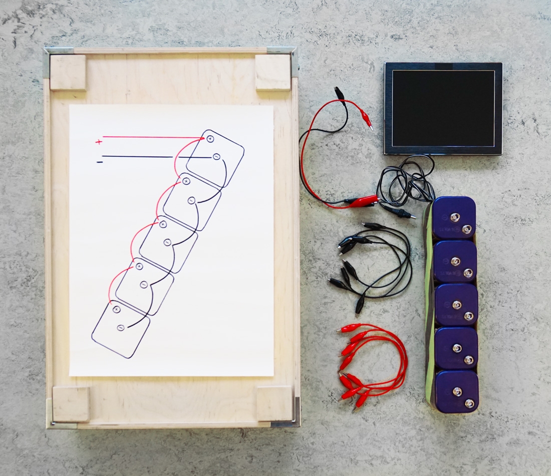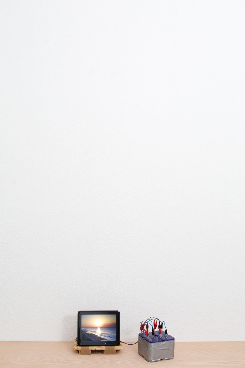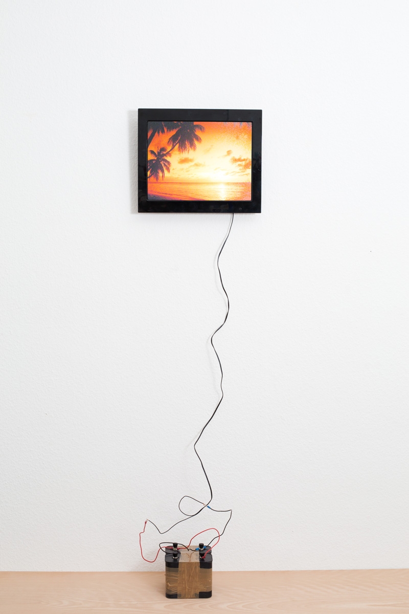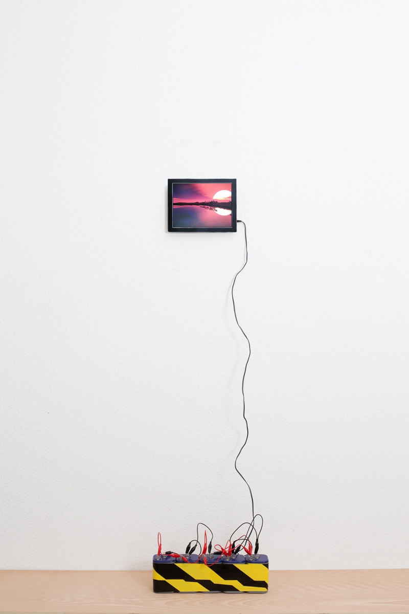 Stock photographs of "ideal sunsets", digital photoframes, and improvised battery pack and wires.
