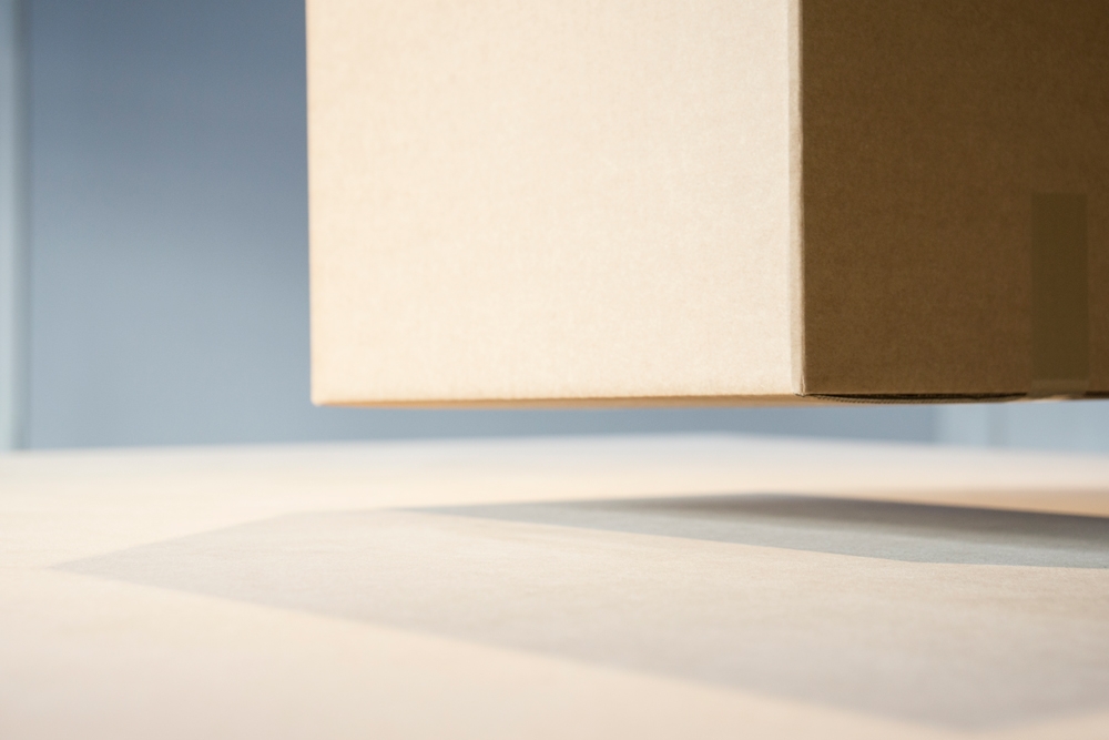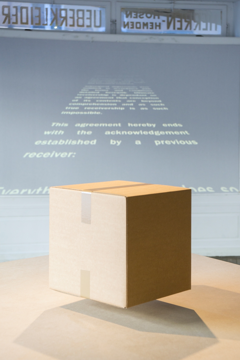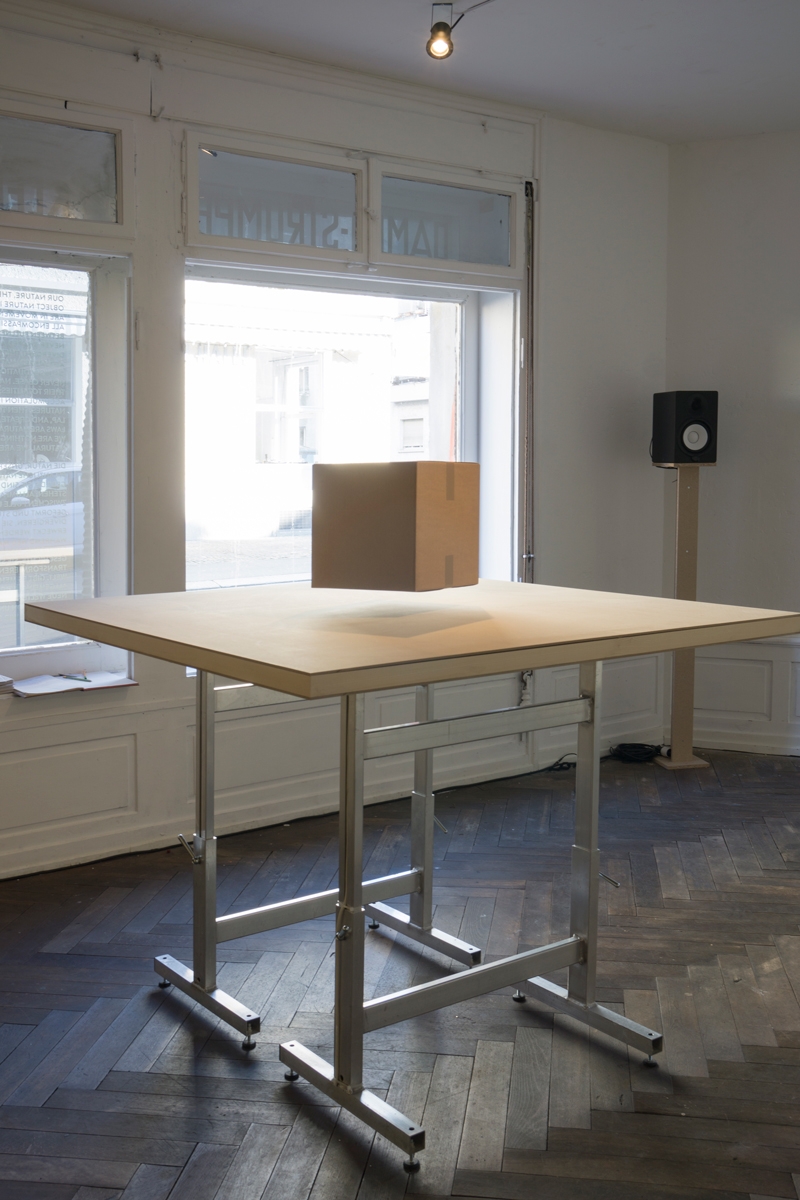 Installation with sound, levitating cardboard box, table and trestles, video projection and text by Chris Fite Wassilak.