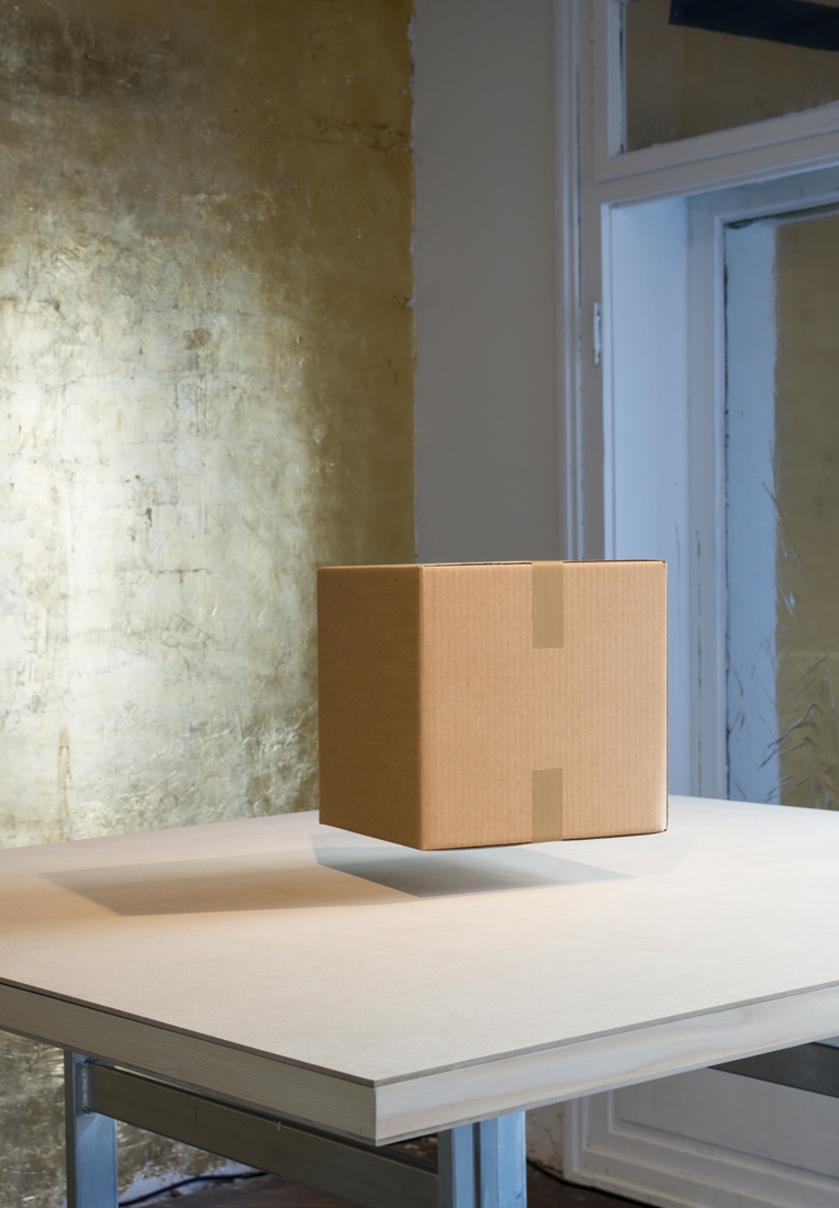 Carboard box 30 x 30 x 30 cm; aluminium trestles, wooden