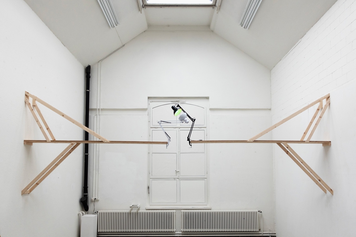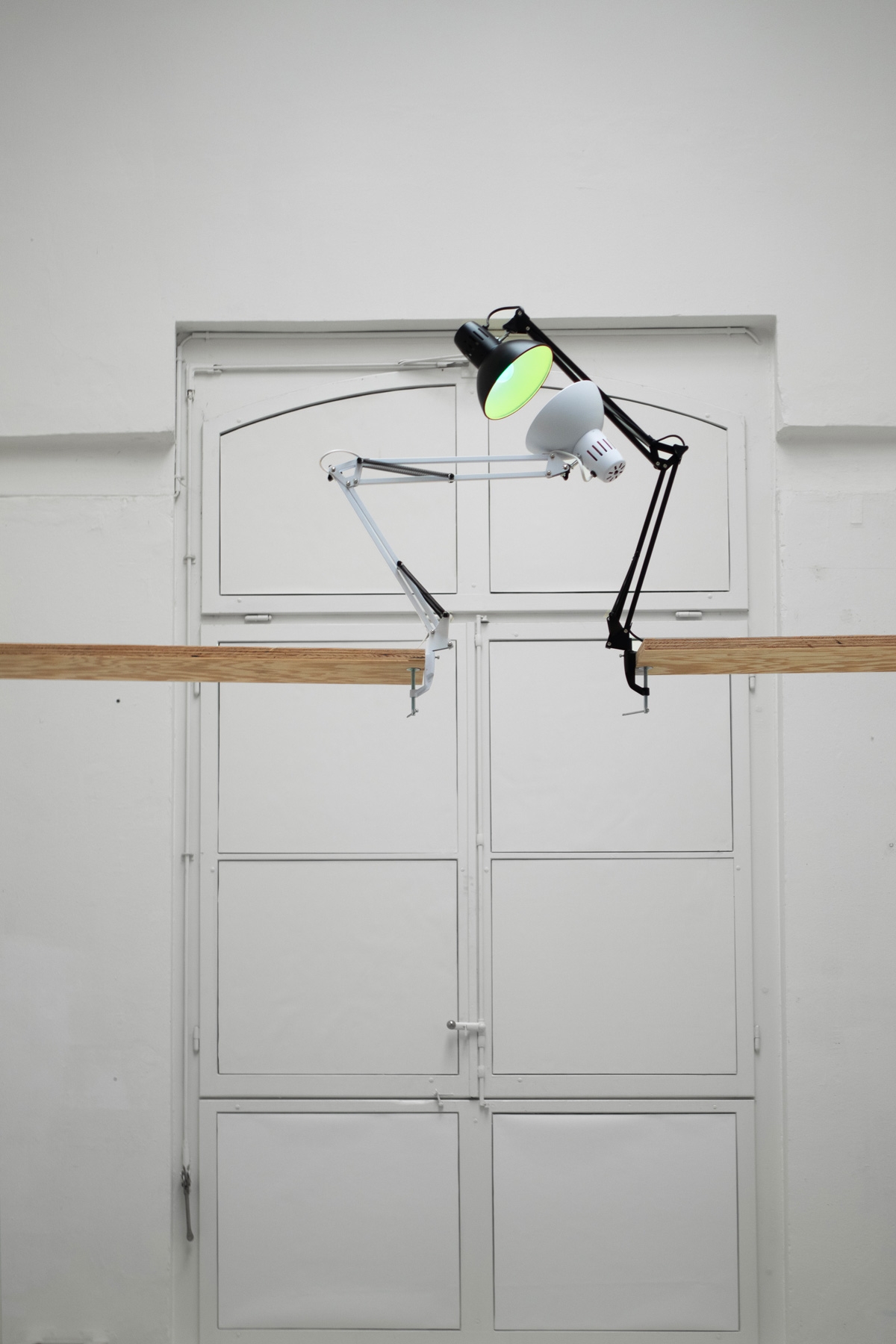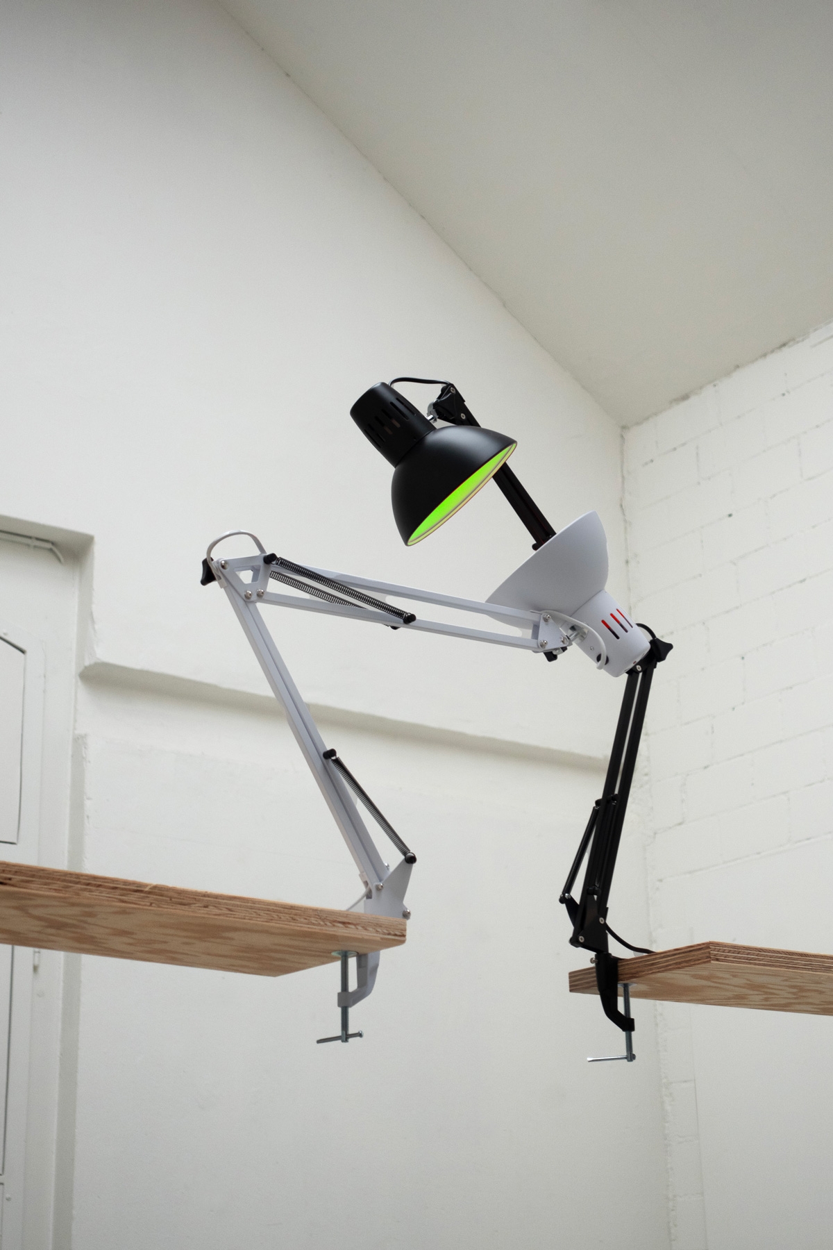 Desklamps, a green lightbulb and a red one, with improvised wooden structure to initiate a stereoscopic embrace.