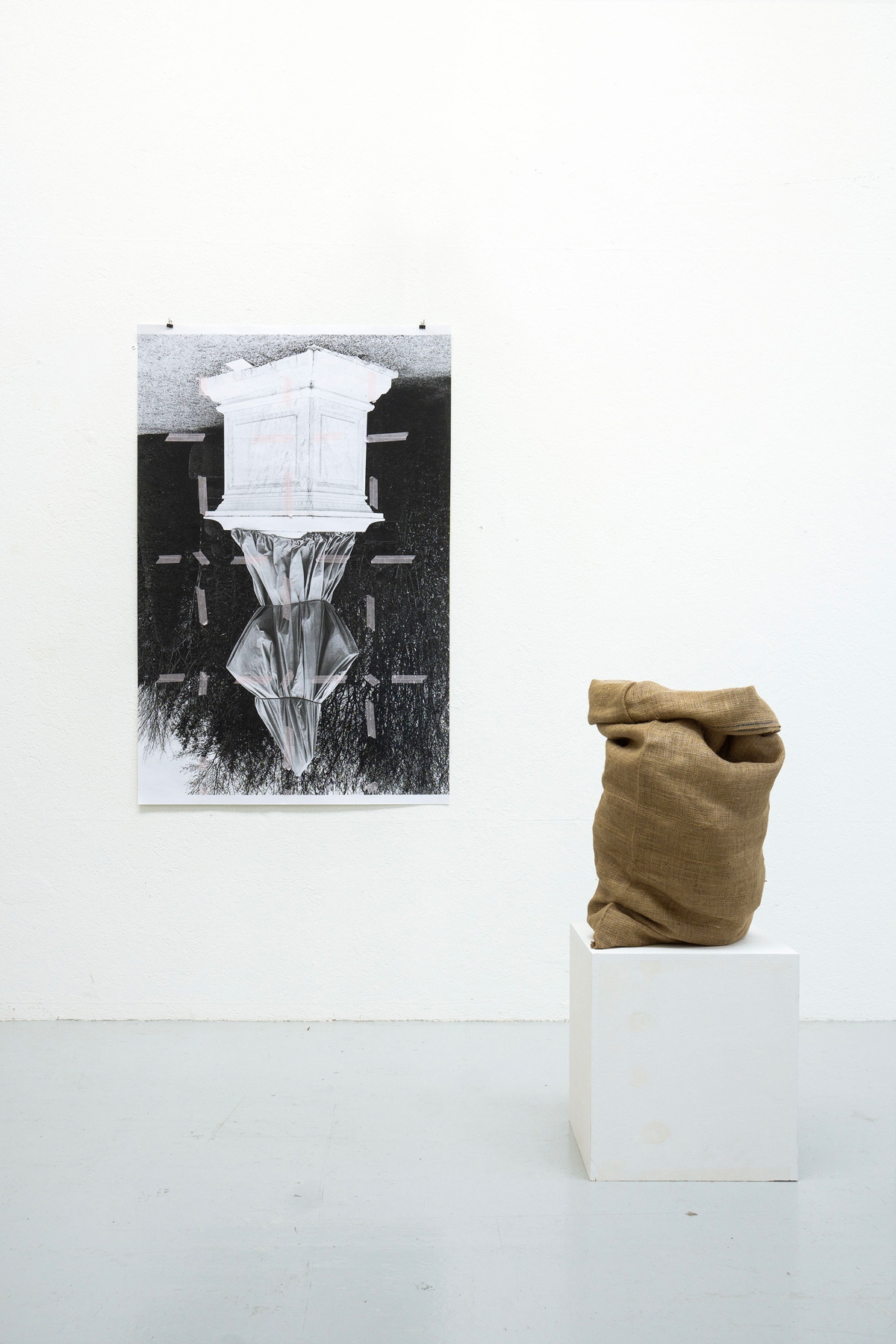Pairings of tile-printed photographs of statues tarped for winter, (assembled with coloured masking tape and shown upside-down), and of jute bags filled with rubble on plinths.