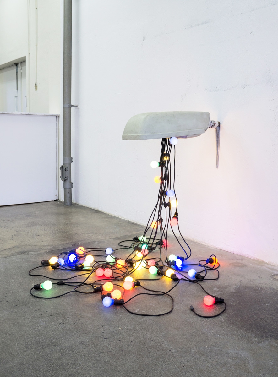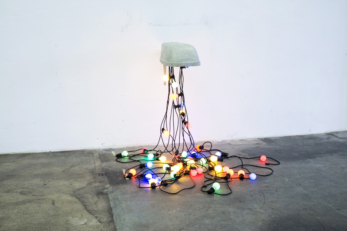Reclaimed street lamp and festoon lights with coloured bulbs.