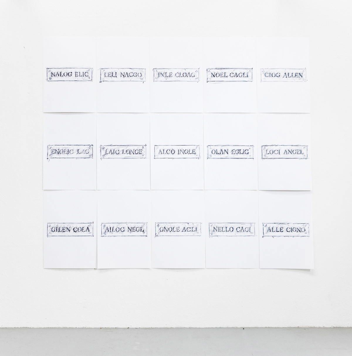 Black wax crayon rubbings of the Logic Lane street sign in Oxford and its multiple anagrams being explored.