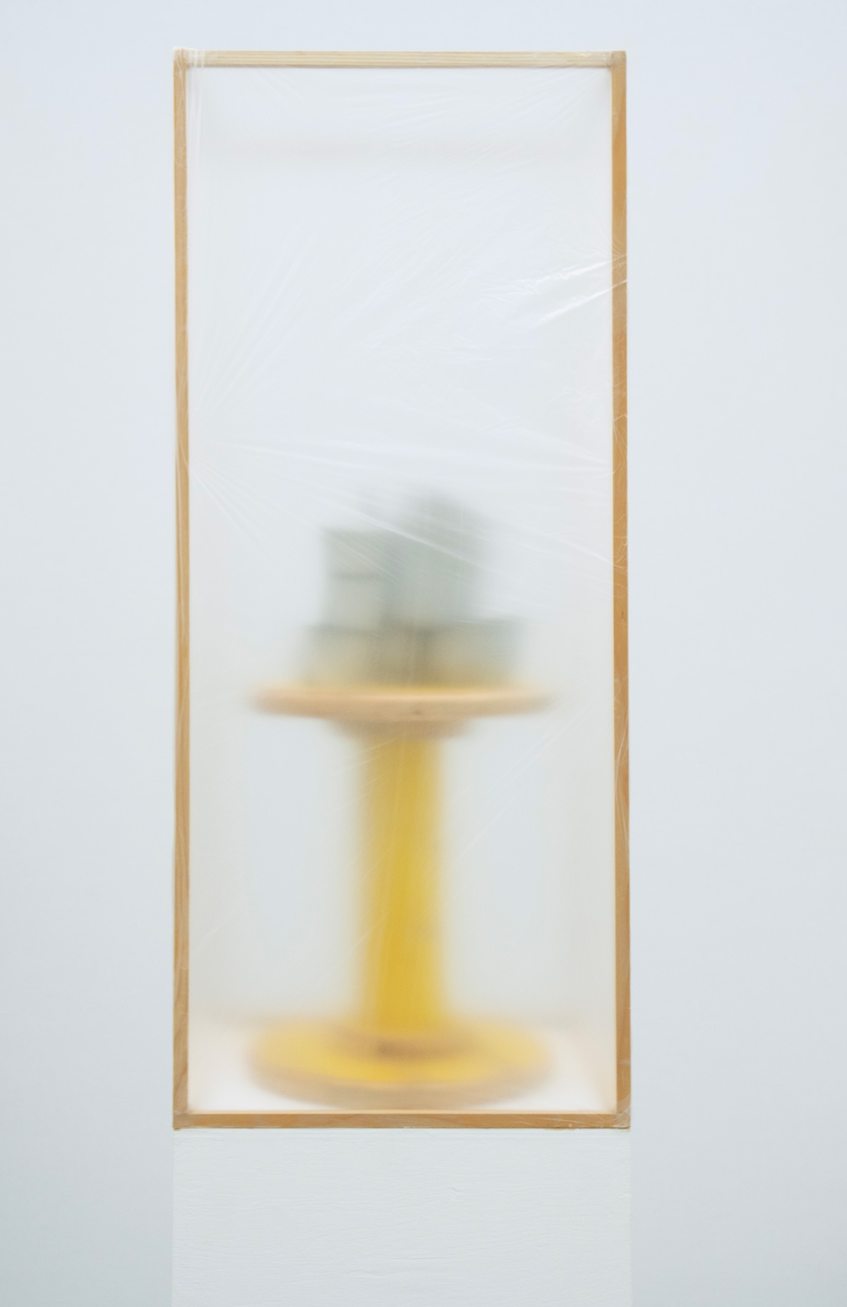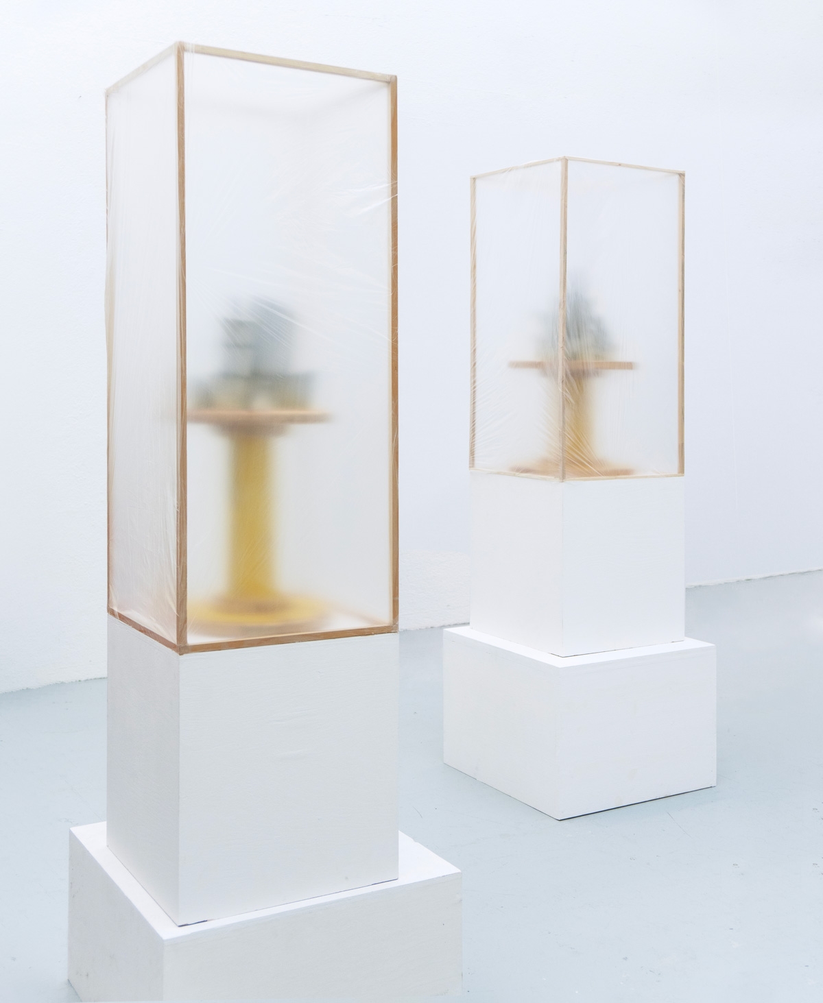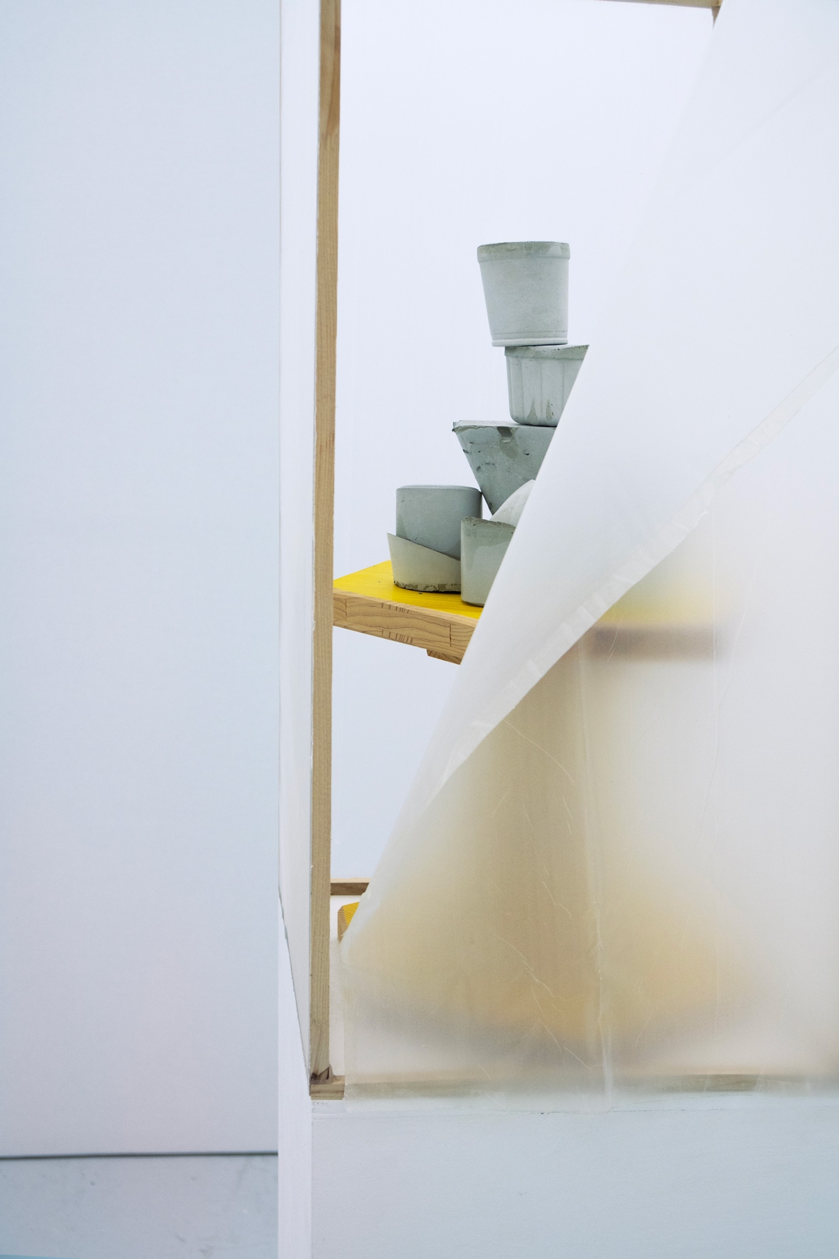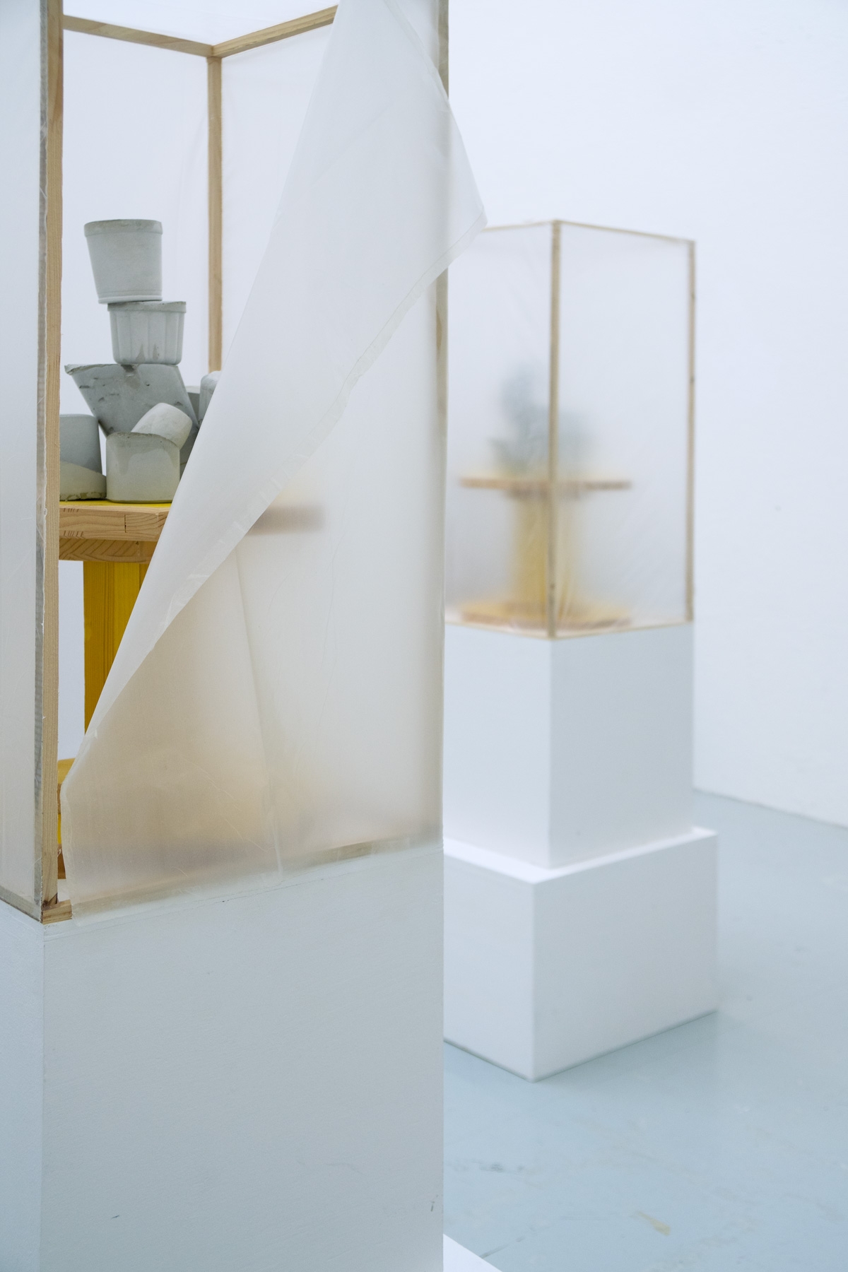 Cornucopiae assembled from stands out of shuttering boards, and negative casts of various food containers in concrete, very pecariously balanced. These are presented on plinths with mock museum cubes made of wood and thin plastic sheeting, introducing opacity as to what the object therein might be. Screened by the frustrated transparency, the cornucopiae cease to be objects to become indistinct, blurred images to seen from four sides—like unsharp depictions of a possible resolution that beg for clarity., between the need to be guessed at and the deniability of understanding what it is.