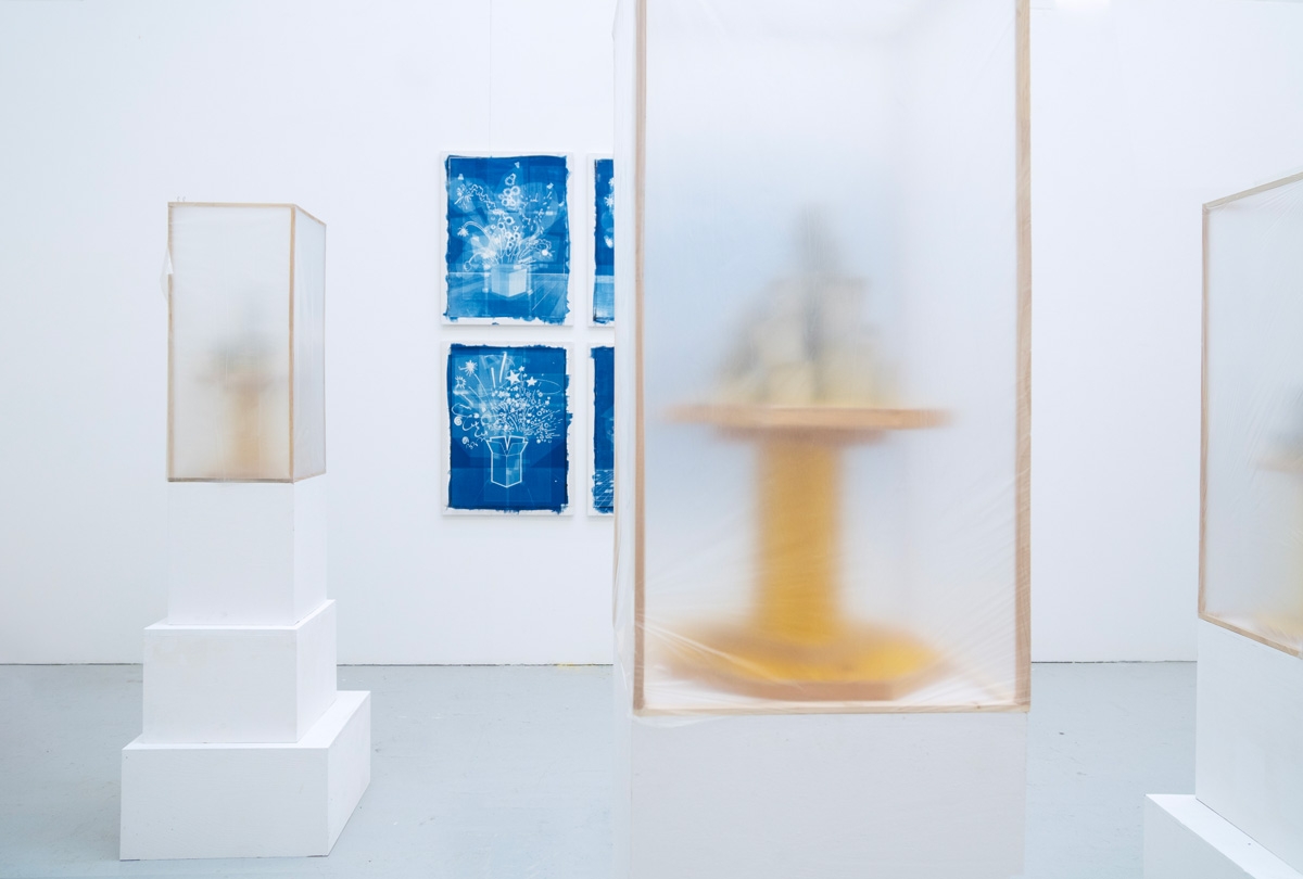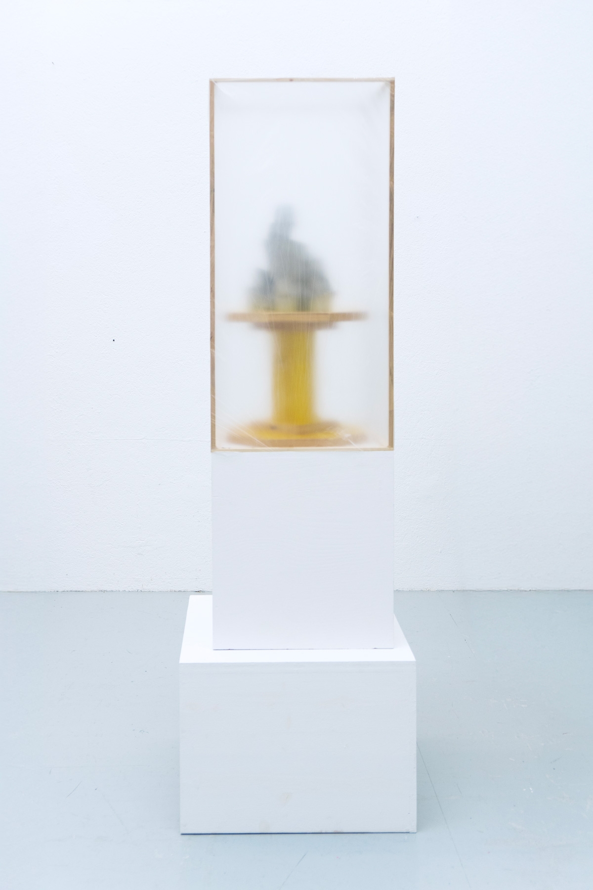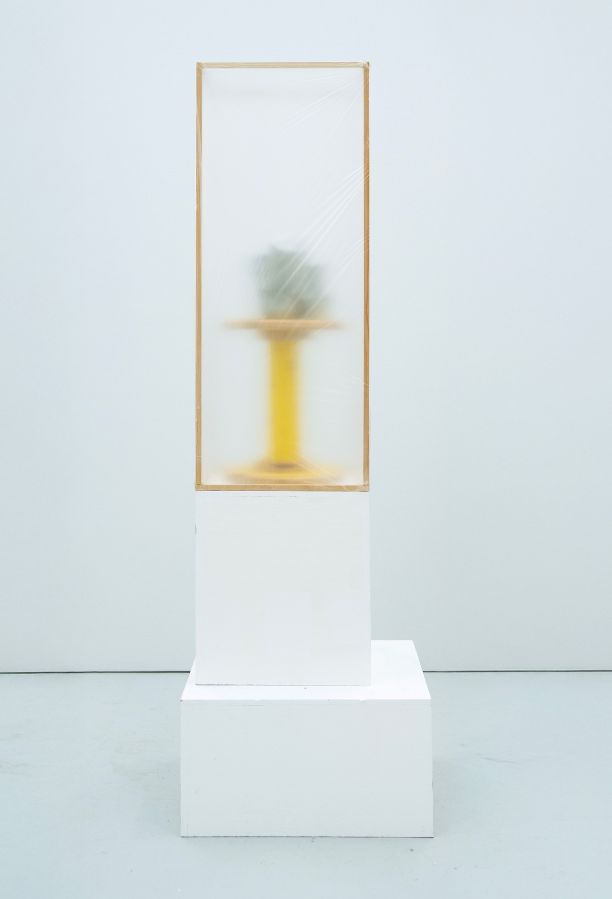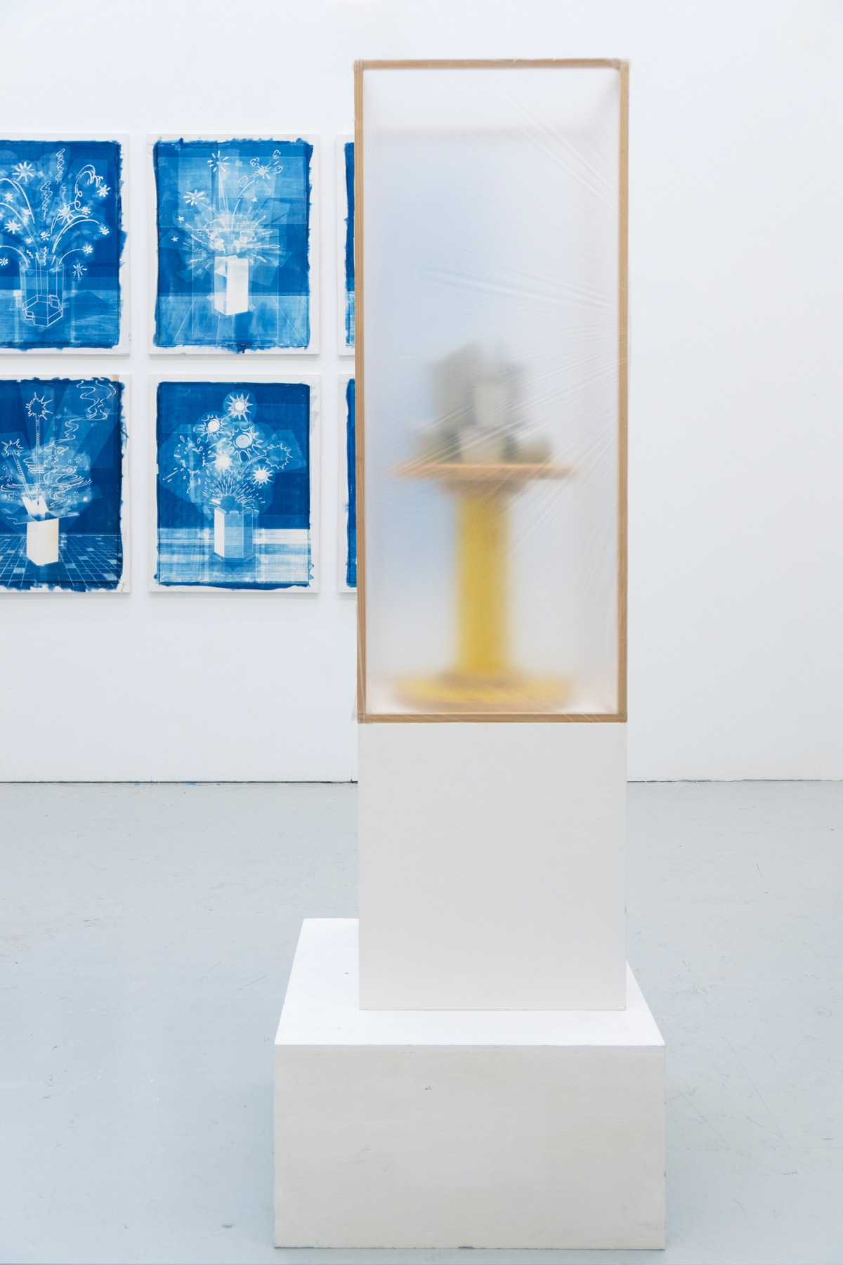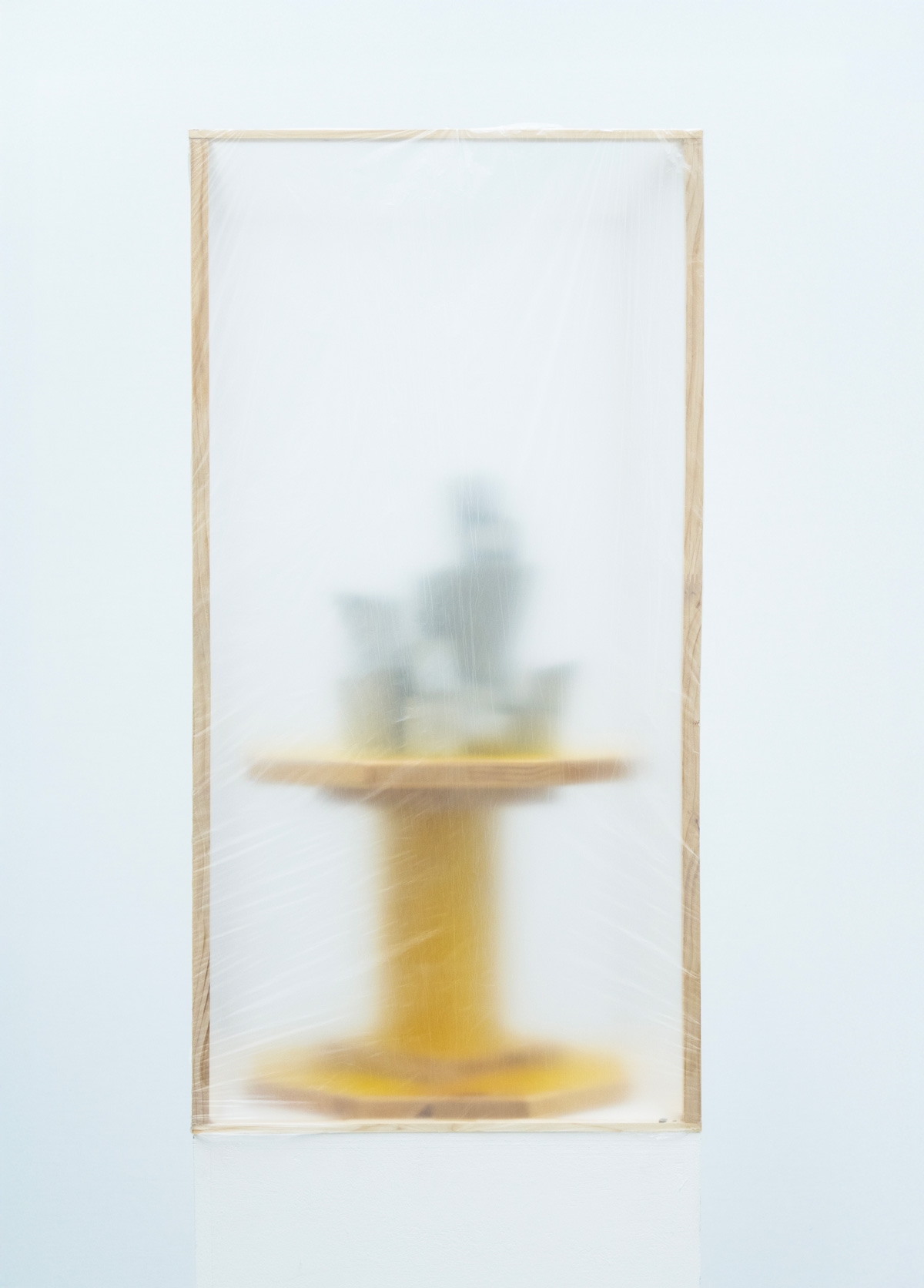 Cornucopiae assembled from stands out of shuttering boards, and negative casts of various food containers in concrete, very pecariously balanced. These are presented on plinths with mock museum cubes made of wood and thin plastic sheeting, introducing opacity as to what the object therein might be. Screened by the frustrated transparency, the cornucopiae cease to be objects to become indistinct, blurred images to seen from four sides—like unsharp depictions of a possible resolution that beg for clarity., between the need to be guessed at and the deniability of understanding what it is.
