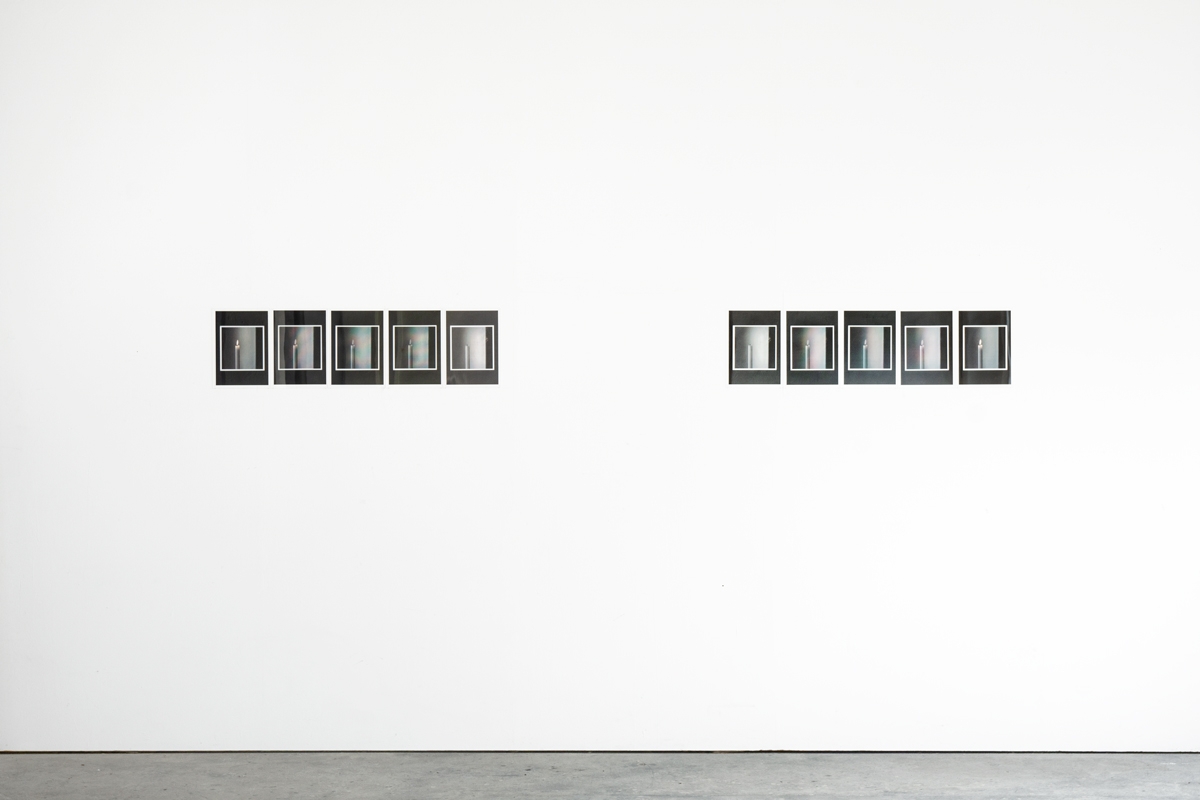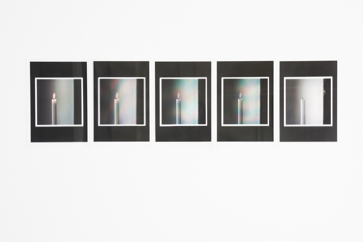 This twinned work articulates from two photographs of a candle – one lit, one blown – in citation of Gerhard Richter’s Candle series. In one grouping, the candle gradually lits; in the other it fades out.