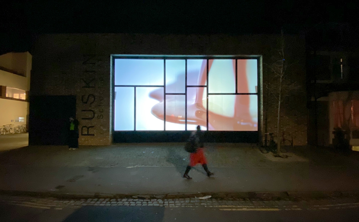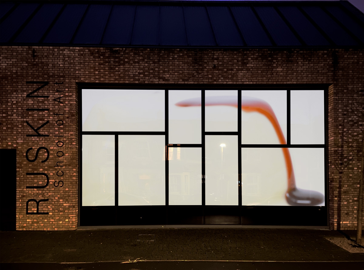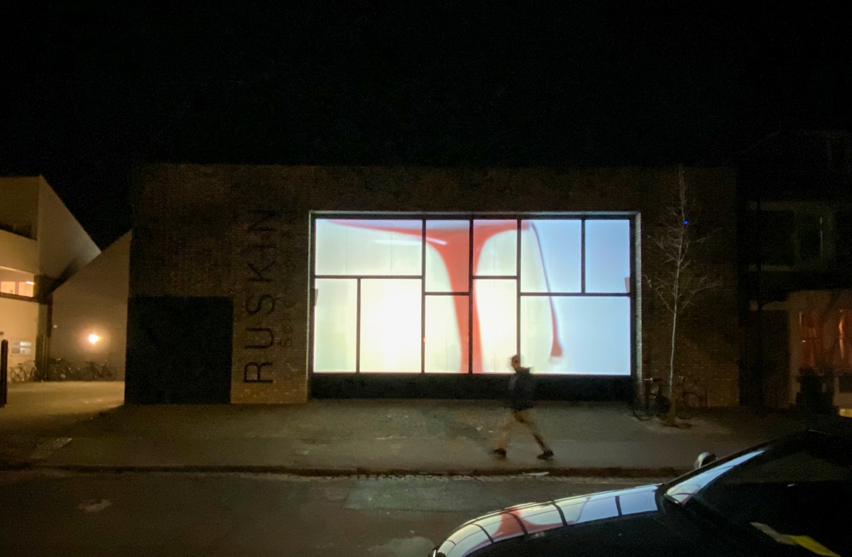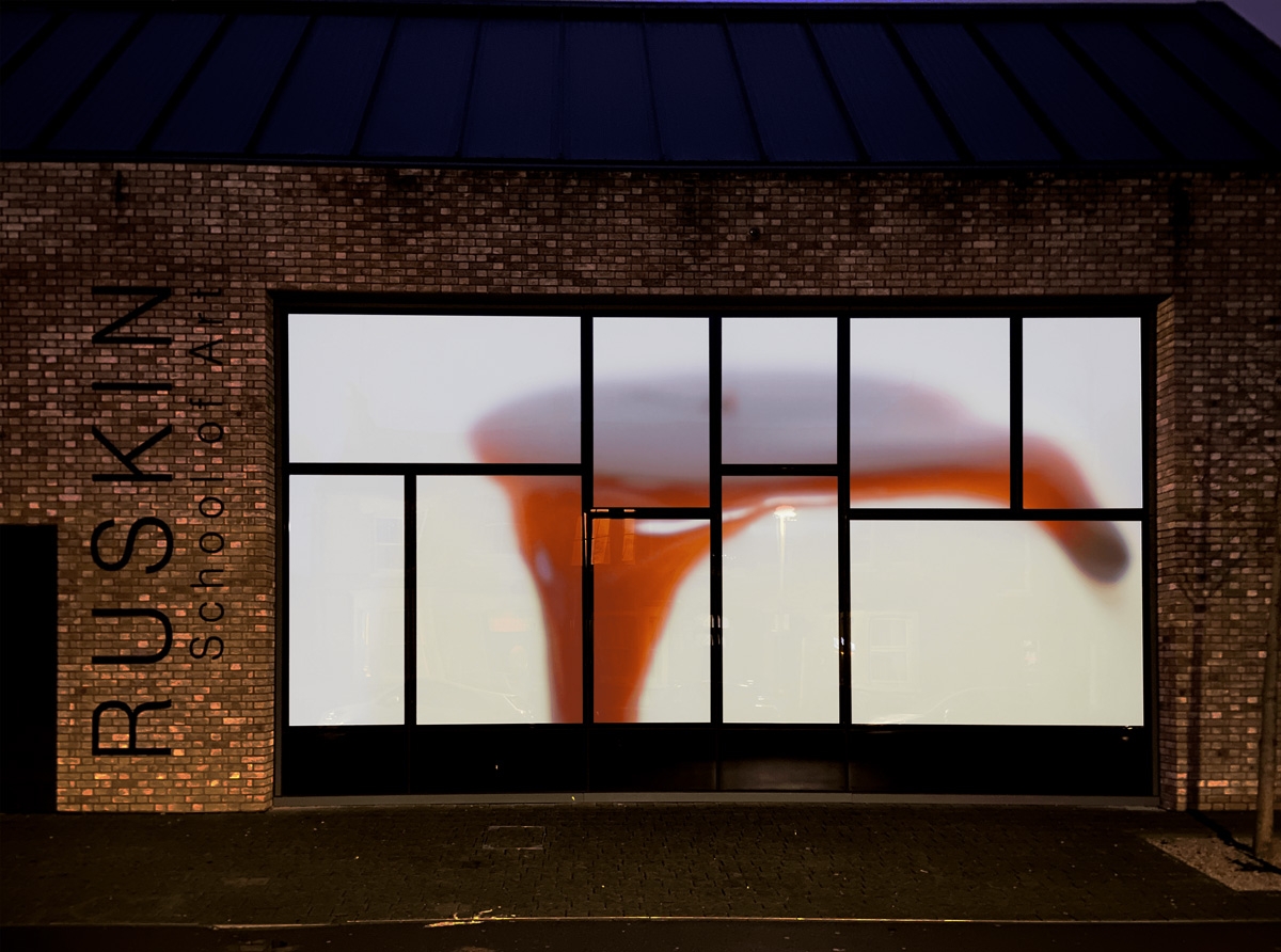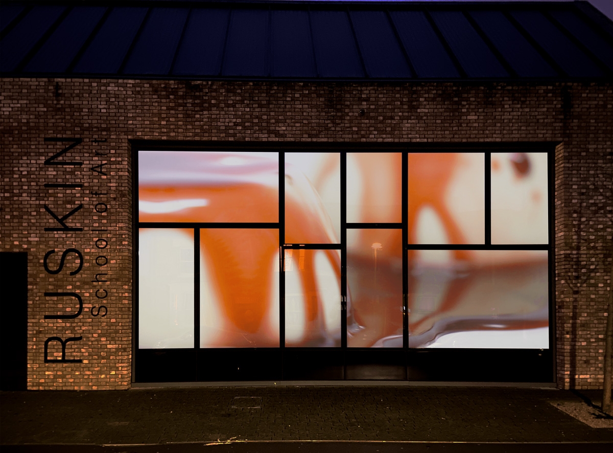 coulis, the pannacottas become more recognisable and the projection more billboard-like. The video and the coulis pouring start as what is colloquiallyknown as “food porn” at its most lustful and suggestive, sliding –thanks to the deep red of the coulis–towards the blood-splattered gorefest more usually reminiscent of horror films.
